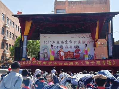 为进一步将传统文化传播至校园,吸引更多青少年关注与喜爱,4月14日,2025年度南京市公益演出在溧水区洪蓝街道渔歌小学精彩上演?!颁嗲臁被泼废肪缤糯淳浠泼废贰赌只ǖ啤贰洞蛑聿荨贰杜@芍《巍返染缒?,演出现场气氛热烈,小朋友们纷纷拍手称赞。(南京日报 通讯员 朱海梅 摄)