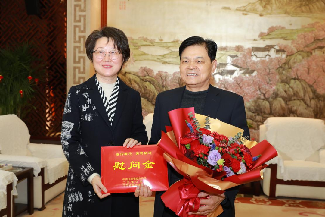 1月18日下午,受省委宣传部、省文明办委托,苏州市吴江区委常委、宣传部部长戴丹来到亨通集团走访慰问全国“时代楷模”、亨通集团党委书记、董事局主席崔根良,为他送上鲜花和慰问金,并致以节日的祝福。
