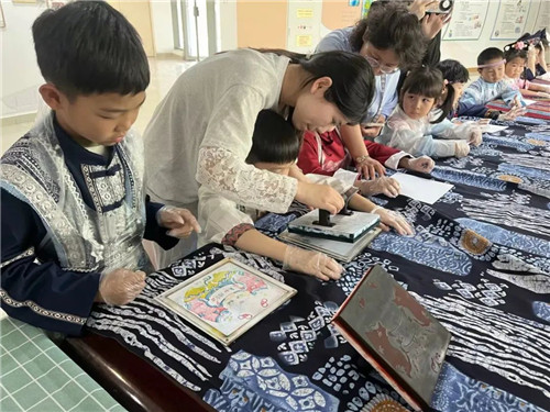 在体验环节,实践站志愿者精心准备了刻好图案的木板、鲜艳的颜料和柔软的纸张。在工作人员的耐心指导下,孩子们纷纷化身“小工匠”,开启了年画创作之旅,他们用小手轻轻按压、抚平,然后一点一点地揭开纸张。当一幅幅色彩斑斓、充满童趣的年画呈现在眼前时,孩子们兴奋得欢呼起来:“快看,我印出年画啦!”“我印的胖娃娃好可爱!”