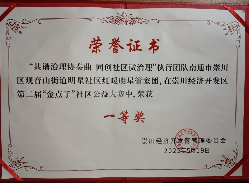 2024年来,“红暖明星”管家团的《共谱治理协奏曲,同创社区微治理》项目在崇川经济开发区第二届社会公益项目“金点子”大赛中获得一等奖。社区党委书记王建春说:“小区治理是一个常态化的工作,正是由于管家团内有这样一批热心人、有心人,小区治理才能更上一个台阶,居民们才能不断感受到平安、幸福和快乐。”