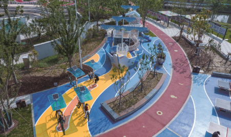 金新街道一“口袋公园”里,居民在使用智能体育设施健身
