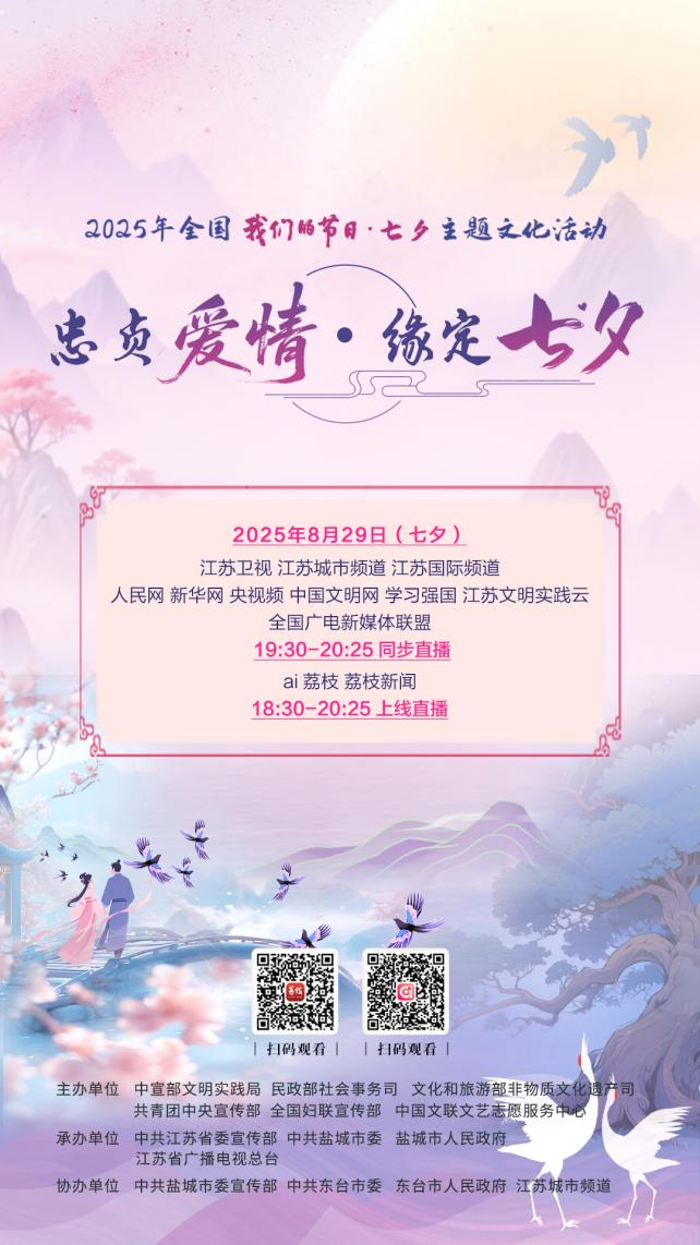 “迢迢牵牛星,皎皎河汉女?!逼呦?,这个独属于中国人的浪漫佳节即将翩然而至。8月29日(农历七月初七)19:30,2025年全国“我们的节日?七夕”主题文化活动将在盐城东台举行。作为全国主场示范活动之一,活动以“忠贞爱情?缘定七夕”为主题,通过非遗展演、民俗体验、文化沙龙、主题晚会、青年联谊等多元形式,在古今交融中传递文明新风,推动中华优秀传统文化创造性转化、创新性发展。