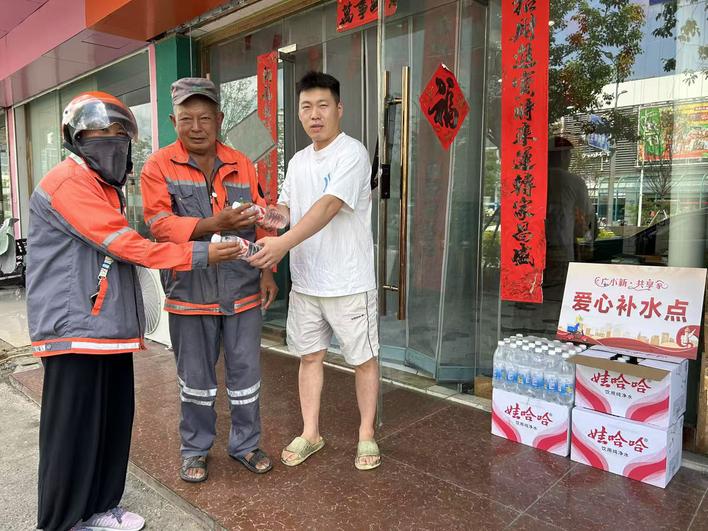 本报讯 (通讯员 吴杰 居萍 记者 陈晨 实习生 方卓尔)7月25日中午,江都路151号一家烧烤店门口,店主张磊正顶着烈日码放饮用水,汗水已浸湿上衣。不一会,穿黄色工装的骑手李师傅停下车,熟练地拿起一瓶盐汽水。张磊笑着递过纸巾:“今天太热了,进来歇一会吧。”
