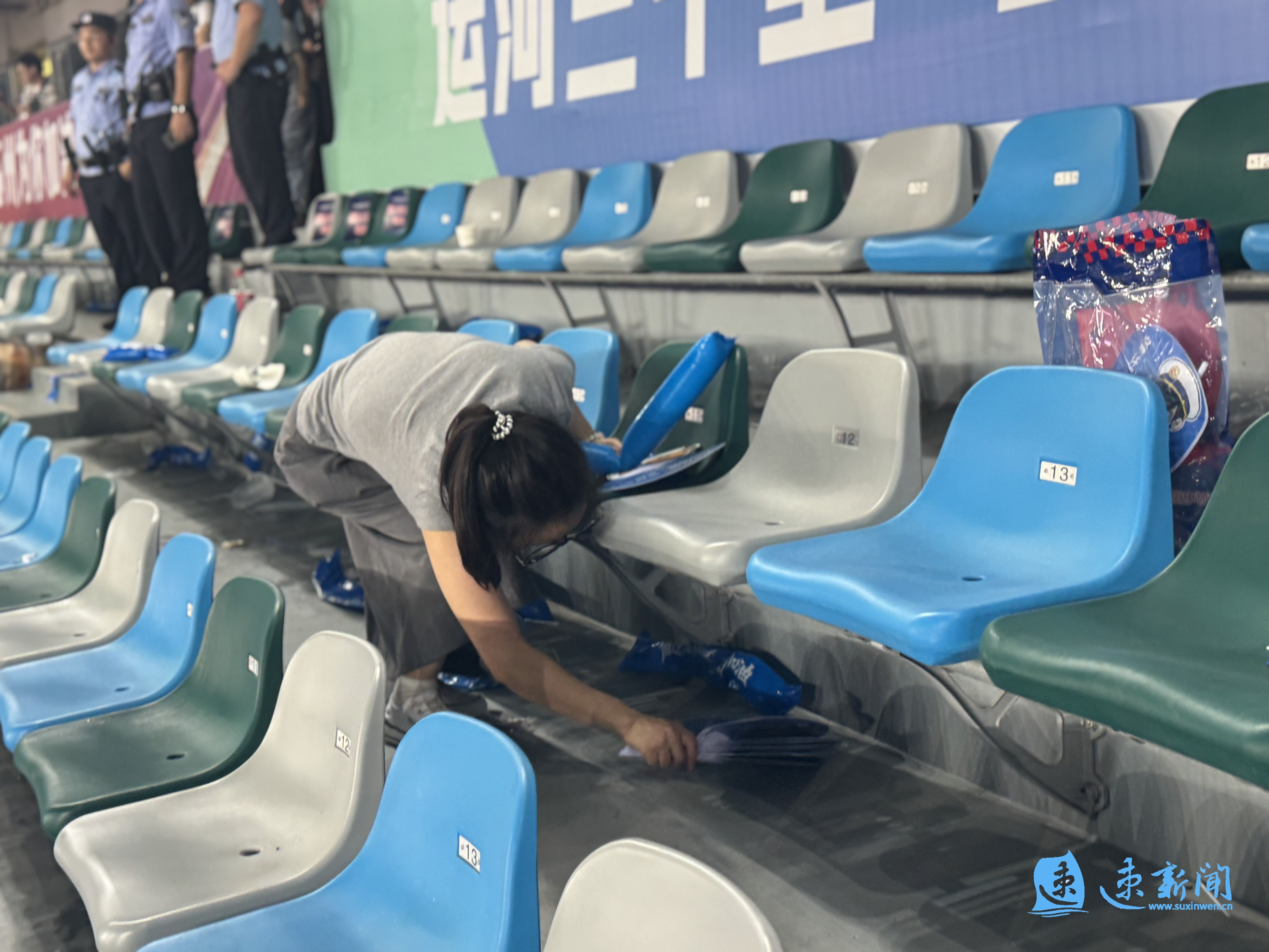 赛后,看台内的一幕暖人心扉。当观众有序离场时,宿豫区延海应急救援队队员陈倩却留了下来。她的目光扫过空荡的看台,落在那些被遗忘的、滚落在座椅下方的应援棒上。