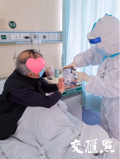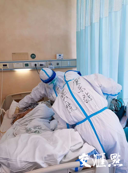在“疫”线的工作并不局限于治疗或护理,更多的是对患者生活上的关心和心理上的支持,传递健康的同时传送温暖。这二十几天里,虞乐群每一次走进病房,总要细心询问观察病人的情况,不放过任何一个细节。有的病人行动不便,她就扶着他们进病房;有的病人不能下床如厕,她就帮忙递上便盆;有的病人呼吸不畅,她就帮忙抬高床头,或者干脆扶他们坐起来……虞乐群的衣服湿透了,她能感觉到自己前额的汗流到护目镜上,模糊了双眼,而她,甩甩头,顾不得休息,继续走进下一个病房。