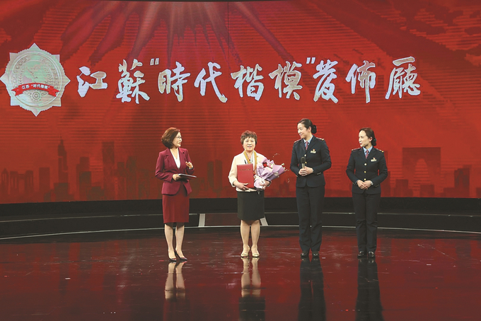 全国“时代楷?!?、南京站“158”雷锋服务站先进集体代表许慧玲、黄吉莉为郑翔颁发奖章和证书。 本报记者 陈俨 摄