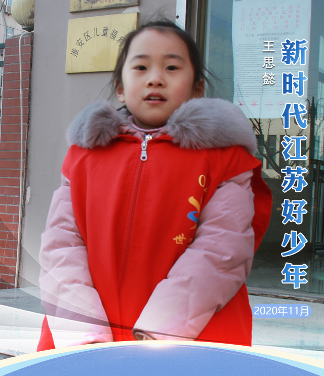 王思懿,女,2011年9月出生,淮安市关天培小学三(10)班学生。王思懿是淮安区世纪爱心服务队最小的志愿者,残疾人康复中心、福利院都留下了她参与公益活动的身影。“居家防疫”期间,她自编自演顺口溜《宅在家里学文化》和《防疫情三字经》,并请家人拍成视频通过抖音、微信朋友圈广泛传播,得到老师、同学及邻居们的夸赞。今年暑假,她主动组织社区留守儿童开展“读国学、诵经典”读书活动,积极参与世纪爱心服务队“红领巾”中队的各类志愿服务活动。王思懿的爷爷王贤忠是一名“中国好人”,她希望能像爷爷一样,用自己的力量帮助更多需要帮助的人。