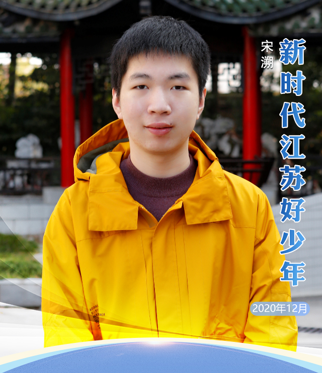 宋溯,男,2005年3月出生,盐城市景山中学初二(1)班学生。宋溯2016年突发疾病,留下了手脚不便和左眼偏盲的后遗症。宋溯是一名坚强的少年,没有因为病痛自暴自弃,他一边康复治疗一边努力学习,付出了比同学双倍甚至更多的时间,成绩一直名列前茅,多次被评为?!叭醚?。宋溯是一名暖心的少年,常帮助同学答疑解惑、辅导课业,照顾低年级学生,协助老师管理班级纪律卫生等。宋溯还是一名孝心少年,总是设身处地的理解父母,主动干一些力所能及的家务活。他热爱文学、阅读、音乐,曾在全国比赛中获得好成绩。疫情期间,他用自己的压岁钱买了数百杯奶茶,向医护人员表达敬意。他希望未来能和父亲一样,成为一名救死扶伤的医生,做一个对社会有用的人。