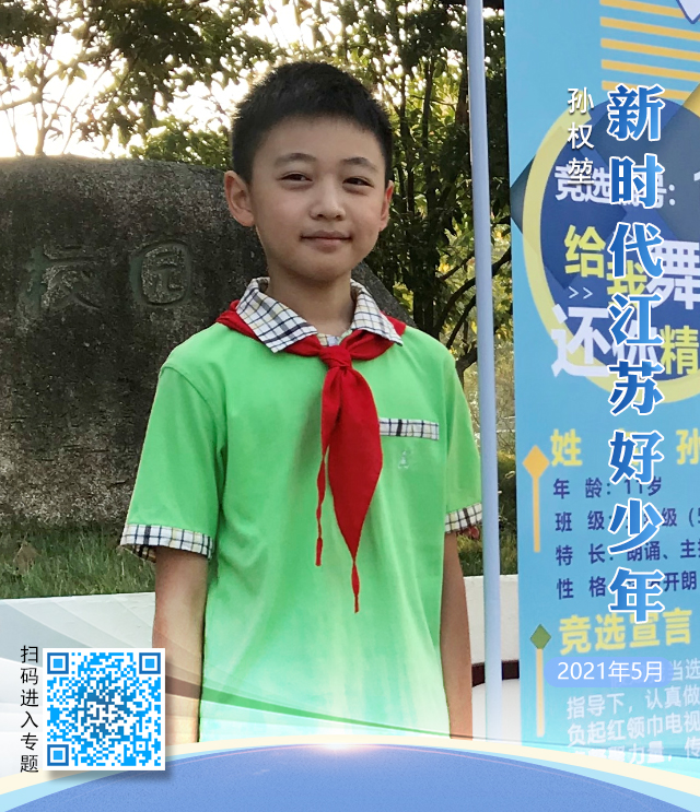 孙权堃,男,2009年5月出生,南京市雨花外国语小学六(5)班学生。孙权堃是校大队委员,他处处以身作则,为老师分担事务,为同学们提供服务,多次被评为校“优秀少先队员”“优秀队干部”。他热心公益,充分发挥自己主持、朗诵等特长,积极参与各类环保志愿服务,呼吁大家培养良好的生活习惯和环保意识。2020年,他参与主持《我爱古诗词——我和长江有个约定》环境日主题活动,通过诵读古诗词向社会传递环保理念;利用课余时间参加“美丽江苏小主人,垃圾分类我行动”等垃圾分类公益音视频拍摄,积极宣传垃圾分类小知识,倡导广大青少年树立垃圾分类意识、践行垃圾分类行动。他说:“身为南京孩子,很高兴能为南京打造美丽古都贡献自己的力量!”