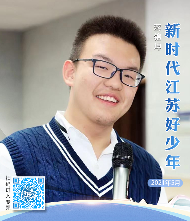 蒋锦坤,男,2006年5月出生,盐城景山中学初三(6)班学生。蒋锦坤阳光开朗、品学兼优,每学期都被评为校“三好学生”“优秀班干部”。身为班级政治和历史课代表,他将盐城128个以革命烈士命名镇村的红色故事,编印成小册子分发给同学们,并为大家讲述曾经生活、战斗、牺牲在盐阜大地的抗日英烈感人事迹。蒋锦坤热心公益、乐于助人,他积极参与“红色大讲堂——我是红色故事传承人”等活动,为参观新四军纪念馆的游客义务讲解30余?。恢鞫斡胛拿鞒鞘写唇?、“爱心伴我行”、“童梦圆”等公益活动,组织同学们看望孤寡老人,为贫困儿童捐赠课外书籍500余本。他表示自己会一直坚持做公益,用实际行动争做“铁军精神”的传承者、弘扬者。